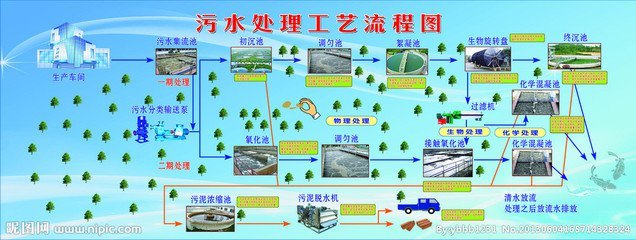 整个过程为通过粗格栅的原污水经过污水提升泵提升后,经过格栅或者砂滤器,之后进入沉砂池,经过砂水分离的污水进入初次沉淀池,以上为一级处理(即物理处理),初沉池的出水进入生物处理设备,有活性污泥法和生物膜法,(其中活性污泥法的反应器有曝气池,氧化沟等,生物膜法包括生物滤池、生物转盘、生物接触氧化法和生物流化床),生物处理设备的出水进入二次沉淀池,二沉池的出水经过消毒排放或者进入三级处理,一级处理结束到此为二级处理,三级处理包括生物脱氮除磷法,混凝沉淀法,砂滤法,活性炭吸附法,离子交换法和电渗析法。二沉池的污泥一部分回流至初次沉淀池或者生物处理设备,一部分进入污泥浓缩池,之后进入污泥消化池,经过脱水和干燥设备后,污泥被最后利用。